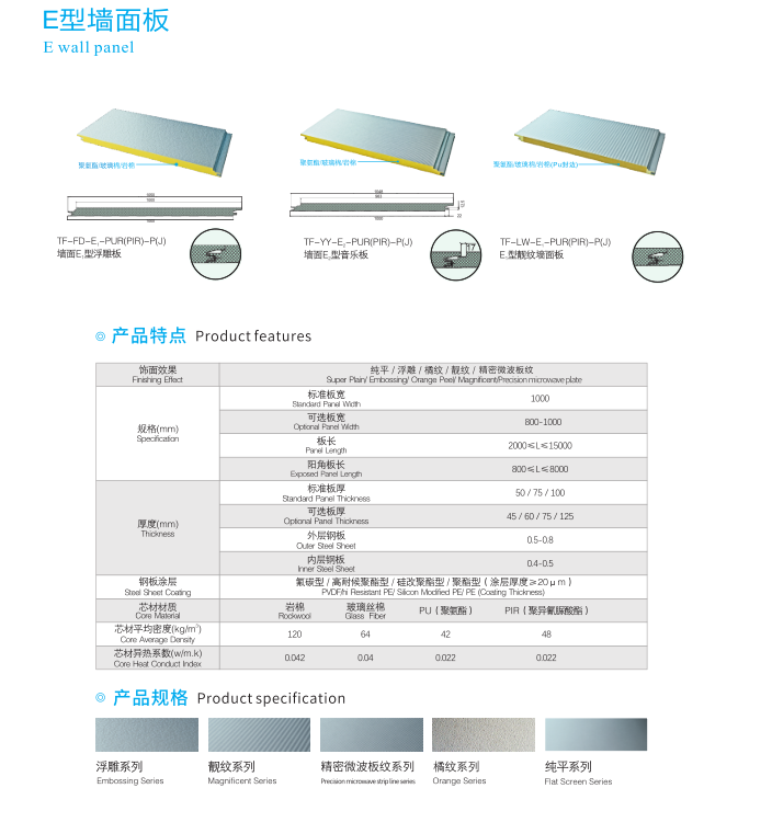 天豐聚氨酯墻面E板及系統(tǒng)是具有保溫、優(yōu)異燃燒等級(jí)和環(huán)保性能的優(yōu)雅恒麗表面圍護(hù)系統(tǒng)。外層面板選用高檔鋼板、氟碳鋁板或鈦鋅板,不僅能長(zhǎng)久地維護(hù)和保持建筑色彩的持久艷麗而且多飾面效果大大豐富了建筑物的內(nèi)涵。高品質(zhì)的隔熱原材料采用了不含氟氯碳化物的聚氨酯PU、聚異氰脲酸酯酸酯PIR或巖棉MW。其較低的導(dǎo)熱系數(shù)可輕易使建筑達(dá)到所要求的保溫隔熱性能和防止結(jié)露的產(chǎn)生,減少墻體厚度,增加建筑的使用空間。