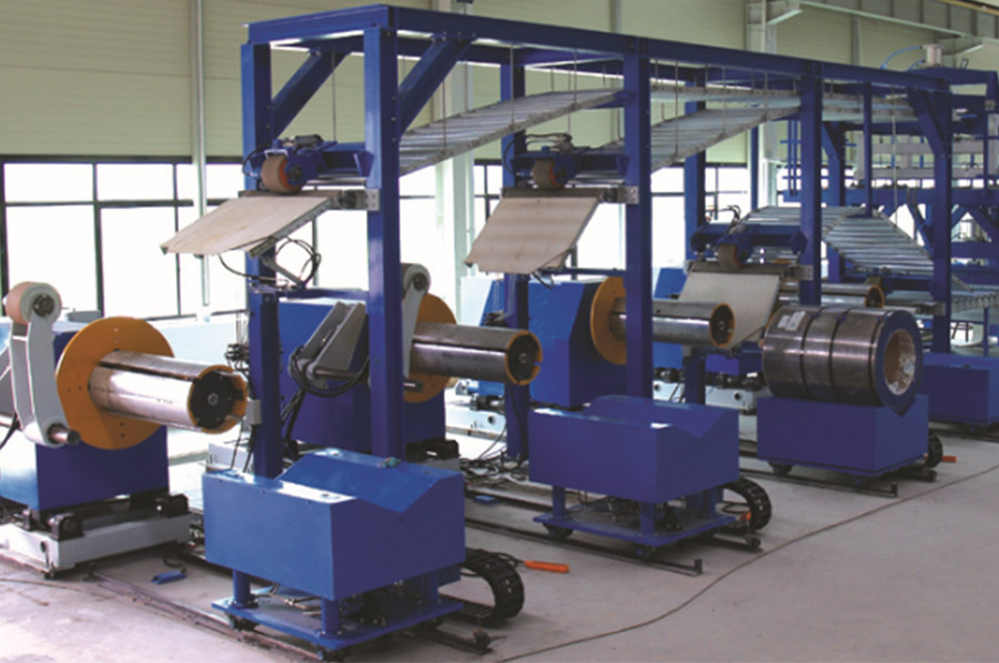 開卷---覆膜---鋼板成型---鋼板預(yù)熱---發(fā)泡固化成型---切割---翻轉(zhuǎn)碼垛---打包